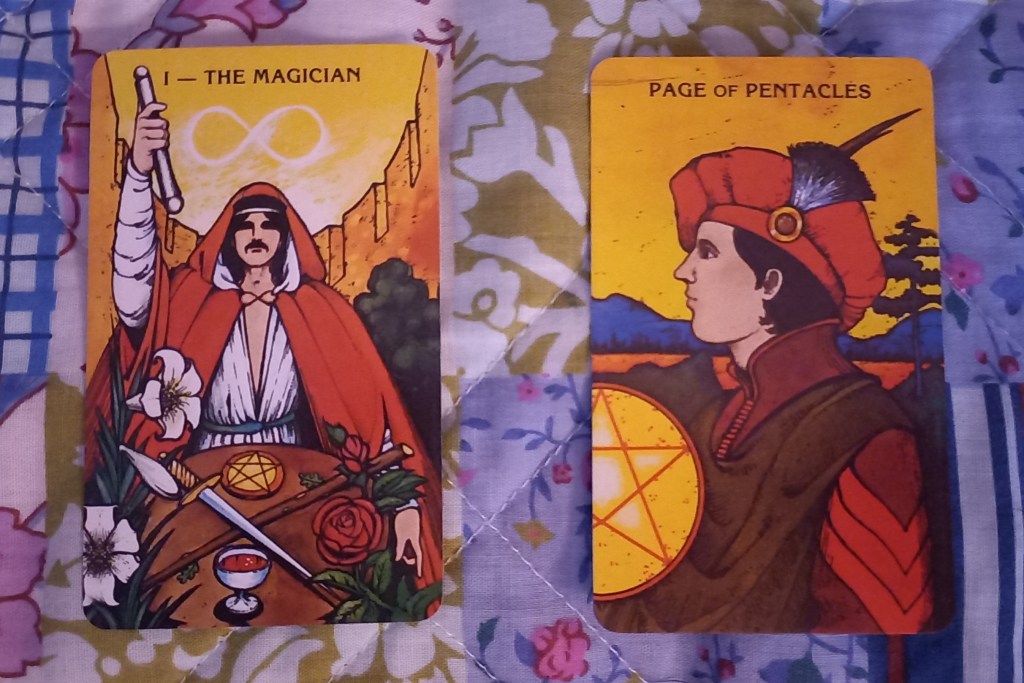 Card 1: Practicing : Page of Swords- practicing rushing into a situation, guns blazing, ready to take on new intellectual challenges and taking on new academic projects.