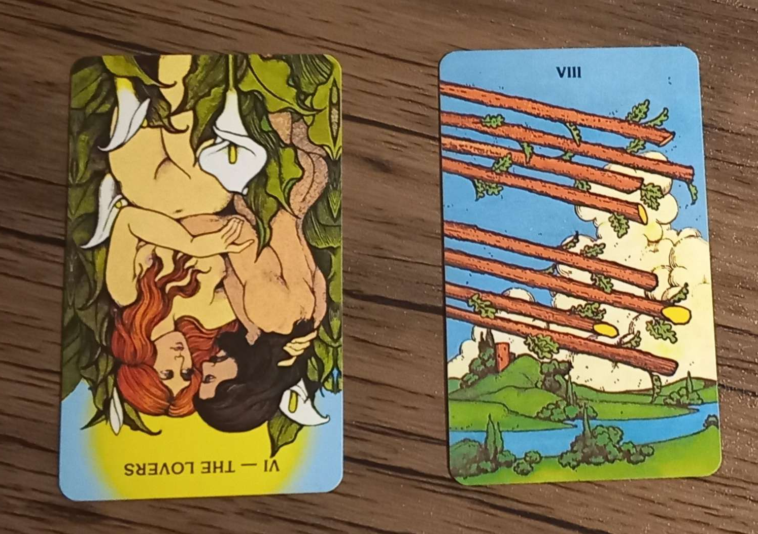 Card 1: The Lovers RX: disharmony, imbalance, lost love. Card 2: 8 of Wands: fast movement, travel, rapid change, going with the flow. A clear choice- I’ll take the go-with-the-flow path if given the chance.