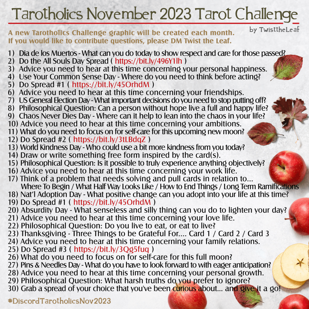 This month I’m trying the Tarotholics Challenge, made by Twisttheleaf over on the discord server I rave about so often. You can follow me here, on facebook or on Instagram to see my progress.