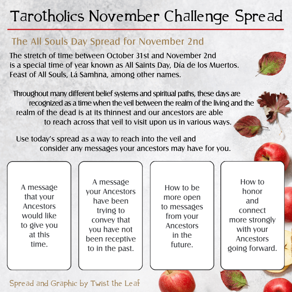 All Souls Day Spread: A message that your Ancestors would like to give you at this time: Card: Knight of Ink (wands) Rx: Just because others don’t see things the way that you do, doesn’t make them wrong. Reign in your pride and try to show some empathy.