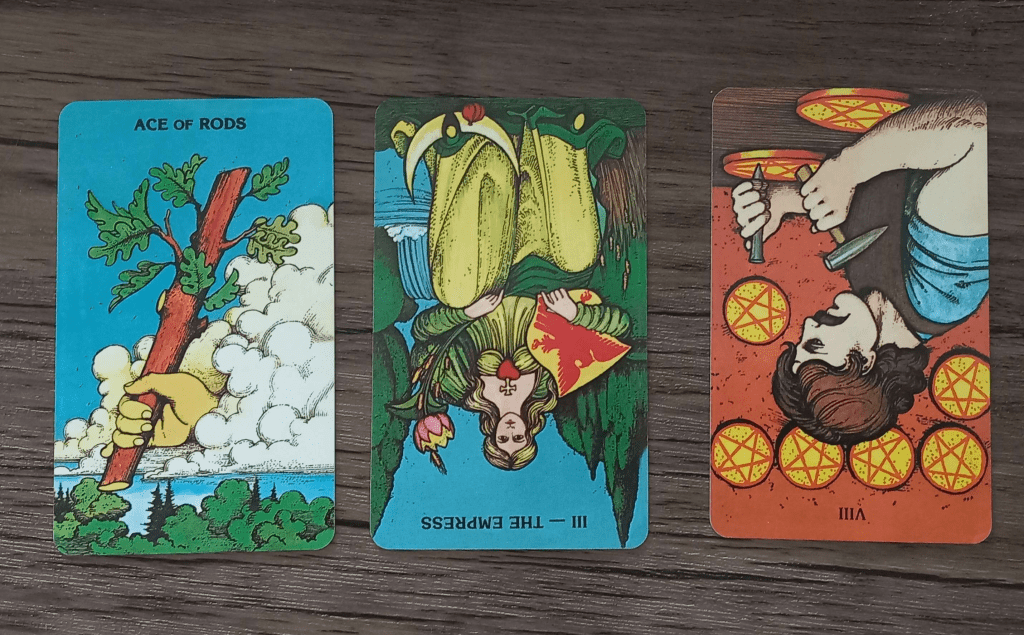 What I’m most looking forward to Autumn bringing: Cards: Ace of Rods, The Empress Rx, and 8 of Pentacles RX.